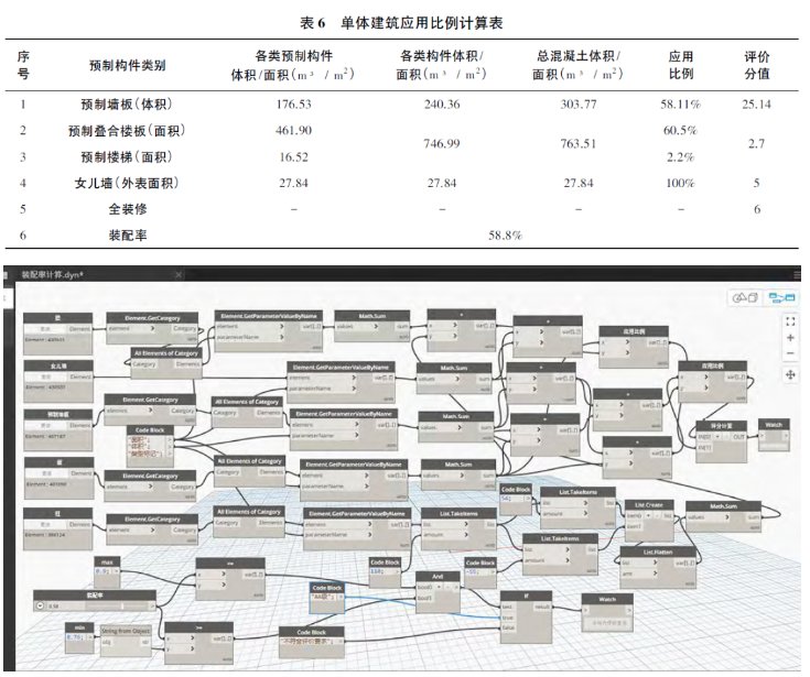 當(dāng)樓梯、內(nèi)墻、剪力墻、疊合板、女兒墻等構(gòu)件分別采用預(yù)制構(gòu)件的情況下,利用BIM通過計算規(guī)則計算預(yù)制部品部件的應(yīng)用比例,其應(yīng)用比例計算結(jié)果見表6。