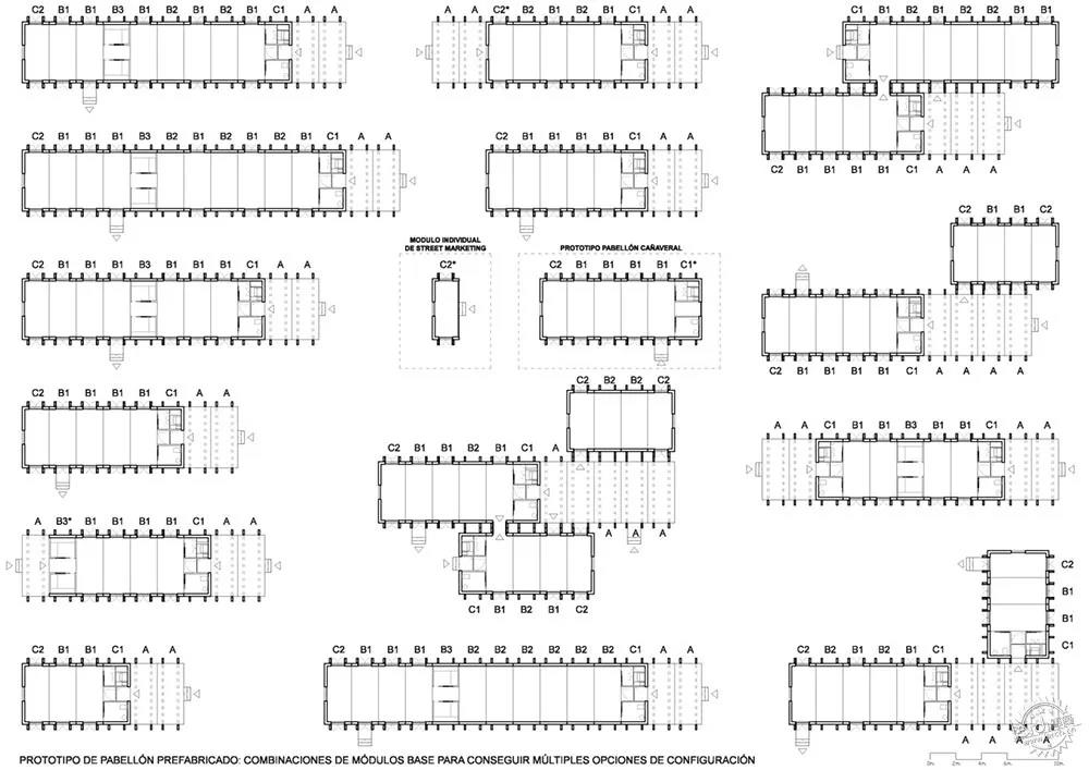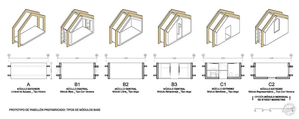 這是一個(gè)靈活重配置的工業(yè)體系。預(yù)制展館原型基于標(biāo)準(zhǔn)模塊的多種形式,是靈活多變的體系。這種模塊化附加類型項(xiàng)目可以根據(jù)不同的項(xiàng)目需求進(jìn)行配置,其中包括大型博物館大廳和小規(guī)模辦公室等多種組合。