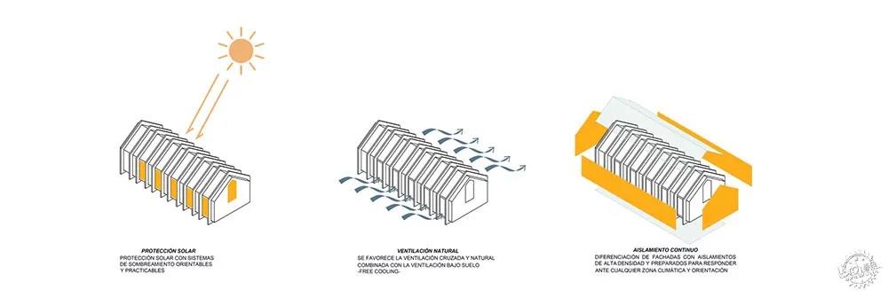 全球化設(shè)計(jì)以減少需求為基礎(chǔ),注重節(jié)能標(biāo)準(zhǔn),建筑師應(yīng)用了許多被動(dòng)式策略,其中包括緊湊連續(xù)的隔熱系統(tǒng)、適應(yīng)性太陽能保護(hù)體系、動(dòng)態(tài)負(fù)荷控制或自然通風(fēng)體系。在高峰需求時(shí),項(xiàng)目的目標(biāo)是在5/7天的10/24小時(shí)中實(shí)行連貫的積極策略,將消耗降至最低。除此之外,建筑師還在整個(gè)項(xiàng)目中結(jié)合應(yīng)用空氣熱能和雙流熱焓回?zé)崞?,這可以通風(fēng)與控制溫度,另外再利用空氣熱能和地暖來減少耗能。