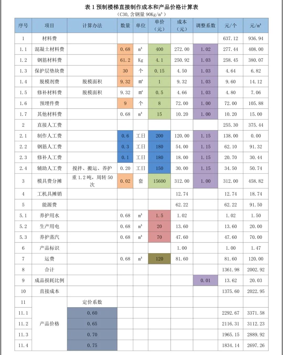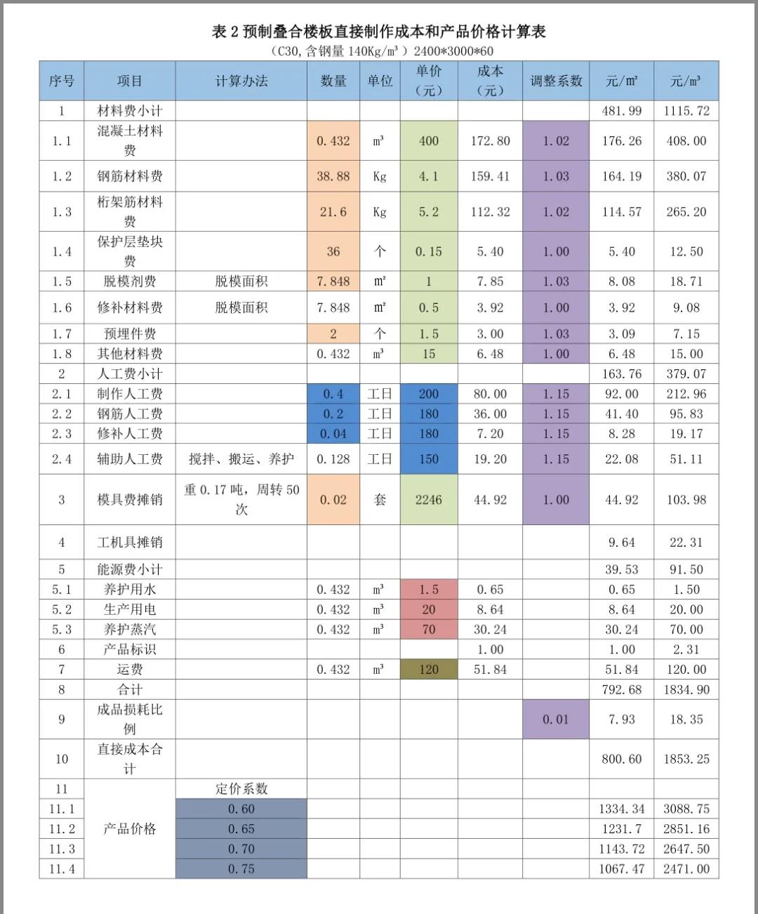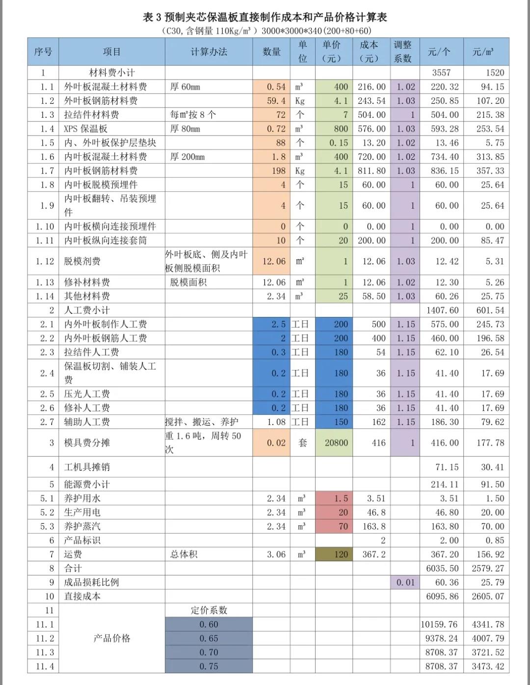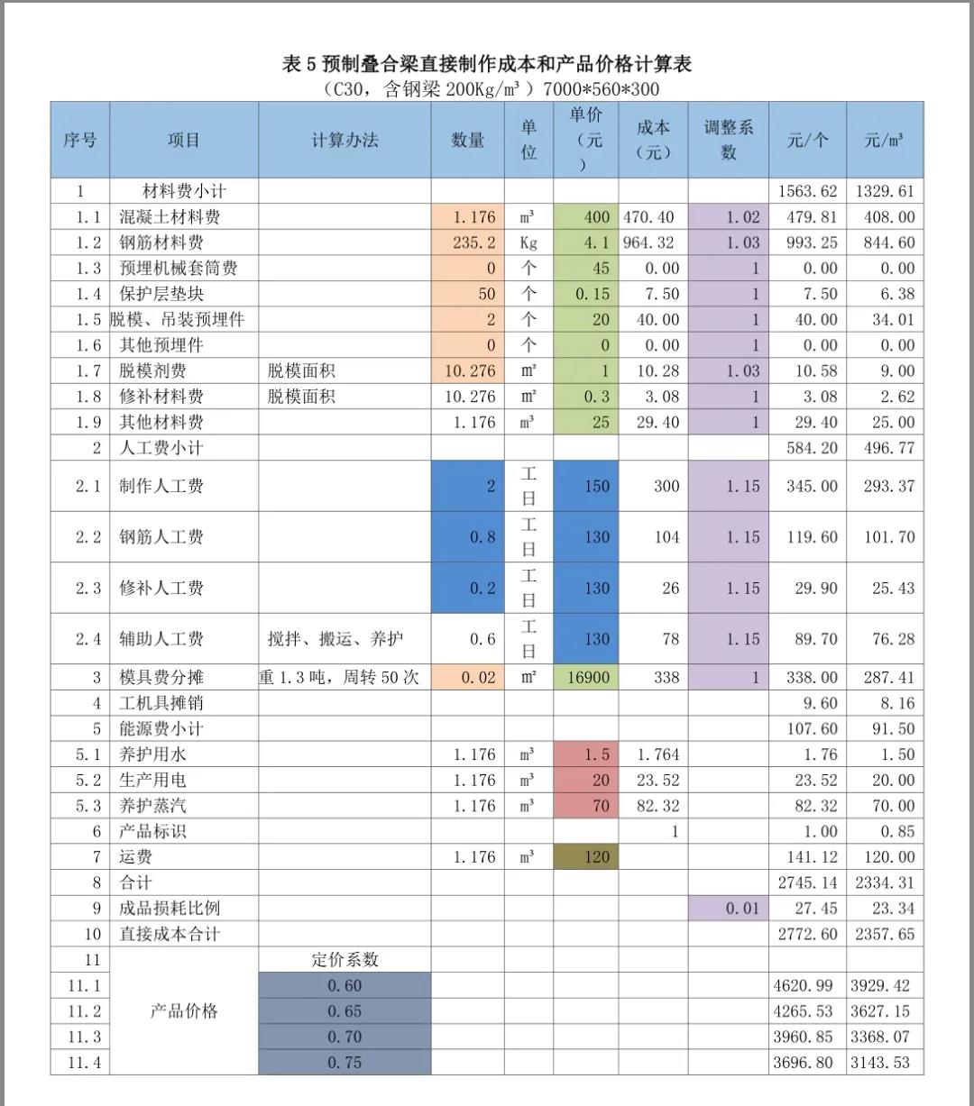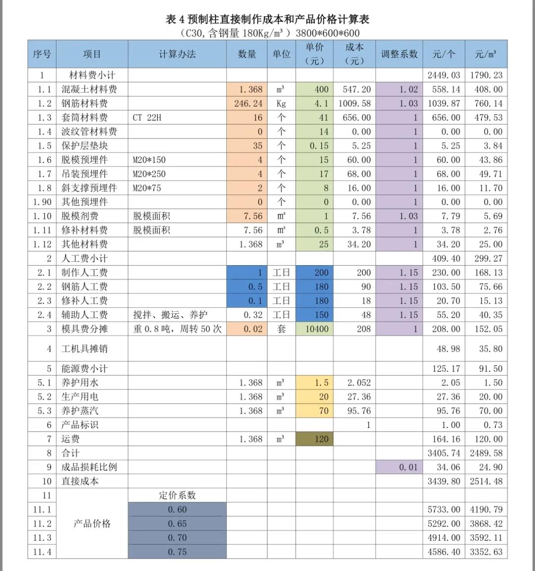 以下分享摘自紅寶書之《裝配式混凝土建筑——如何把成本降下來》,是從構(gòu)件廠家的角度進(jìn)行的價格組成介紹,亦可用于對預(yù)制構(gòu)件價格合理性判斷的方法。(1)預(yù)制構(gòu)件銷售價格的計算方法和步驟我們計算預(yù)制構(gòu)件價格的步驟一般是以下四步:2)然后計算費(fèi)用(包括間接制作成本、營銷費(fèi)用、財務(wù)費(fèi)用和管理費(fèi)用)、稅費(fèi)和利潤這三個方面在價格中的比例。3)用100%減去上述的比例,就得到了定價系數(shù)——直接制作成本在價格中的比例。4)用直接制作成本除以定價系數(shù)就得到了預(yù)制構(gòu)件價格。即:預(yù)制構(gòu)件價格=直接制作成本/定價系數(shù)。通過成本要素統(tǒng)計法,計算得到某一類預(yù)制構(gòu)件的直接制作成本是1800元/m3。②計算費(fèi)用占預(yù)制構(gòu)件價格的比例。通過對以往數(shù)據(jù)的統(tǒng)計和計劃預(yù)算的分析,確定費(fèi)用(包括間接成本、營銷費(fèi)用、財務(wù)費(fèi)用和管理費(fèi)用)占預(yù)制構(gòu)件價格的比例為20%。③ 計算稅費(fèi)占預(yù)制構(gòu)件價格的比例。通過對增值稅抵扣情況的統(tǒng)計分析和土地使用稅和房產(chǎn)稅的分?jǐn)?,稅費(fèi)占預(yù)制構(gòu)件價格的比例為10%。根據(jù)企業(yè)經(jīng)營目標(biāo),確定預(yù)期的利潤率為10%。匯總上述比例,該構(gòu)件的費(fèi)用、稅金、利潤占預(yù)制構(gòu)件價格比例的合計為40%。100% - 40%=60%;定價系數(shù)為0.60。需要注意的是,在計算和確定預(yù)制構(gòu)件的定價系數(shù)時,要根據(jù)費(fèi)用分?jǐn)傉碱A(yù)制構(gòu)件價格的比例、預(yù)期的利潤率和稅費(fèi)在預(yù)制構(gòu)件價格中的比例,根據(jù)市場行情的分析,根據(jù)企業(yè)狀況和定價策略等因素確定。預(yù)制構(gòu)件銷售價格=直接制作成本/定價系數(shù)=1800/0.60=3000元/m3。(2)預(yù)制構(gòu)件銷售價格的計算表格和工具也可以用Excel表方便的進(jìn)行預(yù)制構(gòu)件直接制作成本和產(chǎn)品價格計算。以下測算表格為舉例說明,各項(xiàng)數(shù)據(jù)僅供參考。表1預(yù)制樓梯直接制作成本和產(chǎn)品價格計算表;表2預(yù)制疊合樓板直接制作成本和產(chǎn)品價格計算表;表3預(yù)制夾芯剪力墻保溫板直接制作成本和產(chǎn)品價格計算表;表4預(yù)制柱直接制作成本和產(chǎn)品價格計算表;表5預(yù)制疊合梁直接制作成本和產(chǎn)品價格計算表。1)成本欄為數(shù)量欄與單價欄的乘積;調(diào)整后成本欄為成本欄與調(diào)整系數(shù)欄的乘積;小計為各分項(xiàng)成本的合計;每個預(yù)制樓梯、每平方米疊合樓板、每個預(yù)制柱、每個預(yù)制梁、每塊預(yù)制夾芯保溫板造價為直接成本除定價系數(shù);每立方米造價為每個預(yù)制樓梯造價、每平方米疊合樓板、每個預(yù)制柱、每個預(yù)制梁、每塊預(yù)制夾芯保溫板造價除混凝土材料數(shù)量。Excel表設(shè)計時已將上述計算公式設(shè)計在表中。2)在表里只要填寫或修改相關(guān)項(xiàng)目數(shù)量、單價、調(diào)整系數(shù)及定價系數(shù)(表中標(biāo)記有顏色的部分),就會得到預(yù)制構(gòu)件的直接制作成本和不同定價系數(shù)下的產(chǎn)品價格。①材料數(shù)量、模具費(fèi)計算使用的數(shù)量由技術(shù)部門提供(橘色)。②材料單價、模具單價(以下各表均按13元/Kg)由采購部門提供(混凝土如果是企業(yè)自產(chǎn)的話,價格可以另行計算而得)(綠色)。③人工費(fèi)數(shù)量和單價由人力資源部門協(xié)同定額管理部門提供(藍(lán)色)。④工機(jī)具攤銷(以下各表取材料費(fèi)的2%)由財務(wù)部門提供。⑤每立方米預(yù)制構(gòu)件需要的水、電、蒸汽費(fèi)由能源管理部門提供(黃色)。⑥每立方米預(yù)制構(gòu)件運(yùn)費(fèi)由運(yùn)輸管理部門提供(土黃色)。4)材料和成品考慮到損耗,增加了調(diào)整系數(shù)(紫色)。5)人工費(fèi)調(diào)整系數(shù)是指工資中還應(yīng)包括勞動保險、公積金、工會經(jīng)費(fèi)、其他福利費(fèi)、勞保費(fèi)用,勞務(wù)公司工人包括勞務(wù)公司的管理費(fèi)等,適當(dāng)分?jǐn)偟敬r的人工費(fèi)用。本章內(nèi)容節(jié)選自紅寶書之《裝配式混凝土建筑——如何把成本降下來》,購買請點(diǎn)擊下面小程序:(注:蘋果手機(jī)用戶,請點(diǎn)擊文末“閱讀原文”)