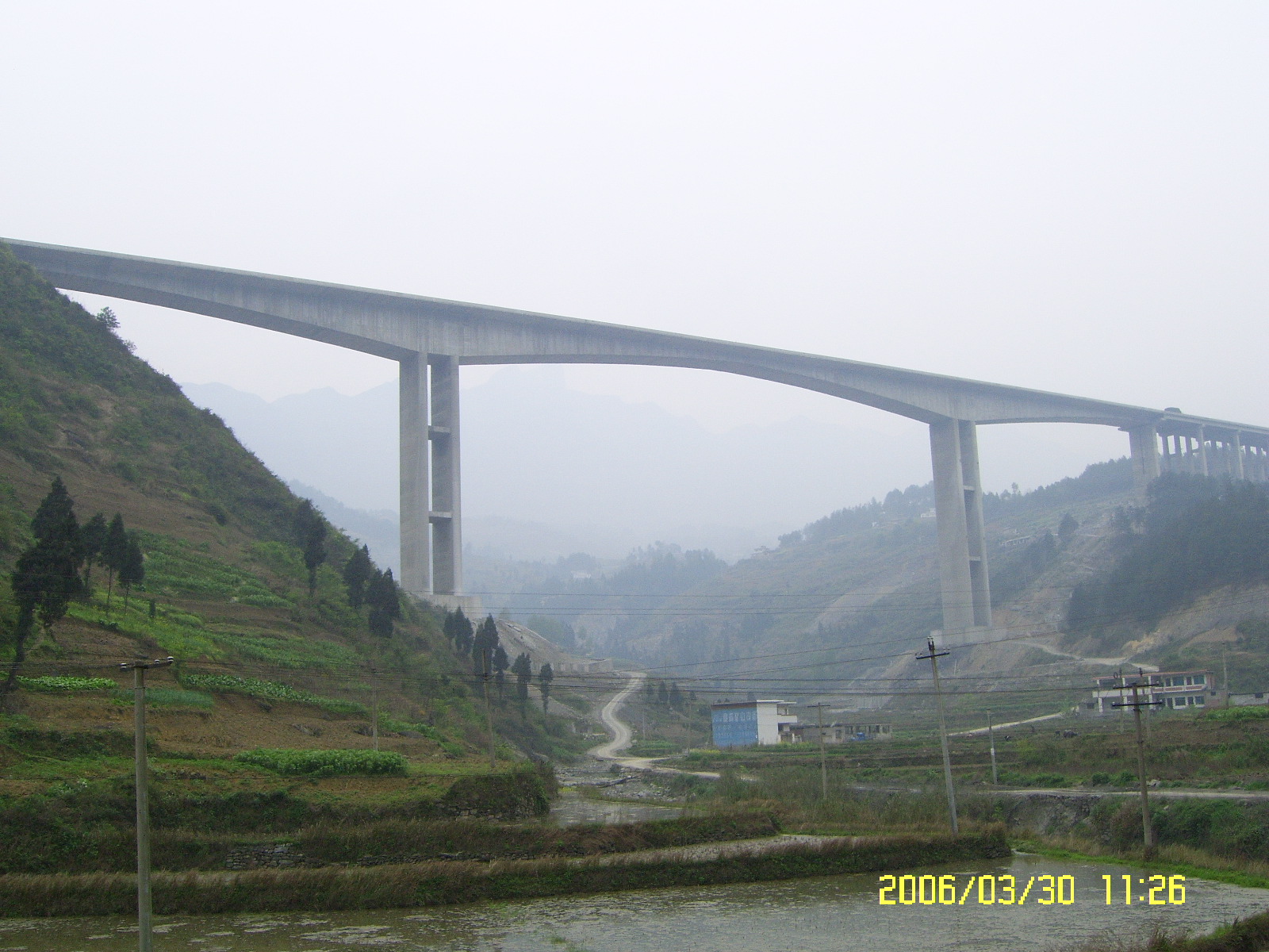 +整幅式連續(xù)剛構(gòu),其箱梁截面為單箱單室,頂板寬,底板寬,下部9#、10#兩個(gè)主墩為雙薄壁高墩,高度分別為、。該橋是國內(nèi)同類橋梁中罕見的集高、艱、難、險(xiǎn)于一體的工程,主跨跨度的整幅式單項(xiàng)單室堪稱全國之最。實(shí)踐證明,該橋的施工離不開科技創(chuàng)新,通過施工,總結(jié)出了一套省內(nèi)大跨度整幅式單箱單室三向預(yù)應(yīng)力連續(xù)剛構(gòu)高速、優(yōu)質(zhì)、安全施工的新技術(shù)、新經(jīng)驗(yàn)。通過驗(yàn)證,各項(xiàng)技術(shù)指標(biāo)均符合設(shè)計(jì)要求,全橋接縫平順,線型美觀。同時(shí),施工中,自行研制了自錨式三角形掛籃,其結(jié)構(gòu)簡單,加工拼裝方便,采用液壓走行即快速又安全,剛度大,變形小,模板移動(dòng)靈活,內(nèi)模板脫模立模移動(dòng)快速方便,掛籃施工安全可靠。還總結(jié)了一套具有國內(nèi)先進(jìn)水平的大跨度連續(xù)剛構(gòu)施工線型控制技術(shù)和應(yīng)力監(jiān)測技術(shù),利用此套技術(shù),對大跨度連續(xù)剛構(gòu)橋進(jìn)行控制,保證了全橋高精度合攏,合攏誤差最大不超過,梁部各截面應(yīng)力值與設(shè)計(jì)相符,全橋質(zhì)量優(yōu)良,線型美觀。另,還對“機(jī)制砂高性能泵送混凝土的配制技術(shù)”進(jìn)行了研究并取得了成果,施工過程中混凝土的各項(xiàng)性能均符合設(shè)計(jì)和施工要求,該項(xiàng)技術(shù)在國內(nèi)建筑市場處于領(lǐng)先水平,也為國內(nèi)河砂缺乏省份澆筑高標(biāo)號高性能混凝土開創(chuàng)了先河,并獲得了2005年陜西省職工經(jīng)濟(jì)技術(shù)創(chuàng)新優(yōu)秀成果三等獎(jiǎng)。韓家店I號特大橋的施工受到了貴州省交通廳等各方的極大關(guān)注,通過科技攻關(guān)和全體員工的努力,強(qiáng)化施工現(xiàn)場管理,于2005年底順利完工,施工過程中積極采用新技術(shù)、新材料、新工藝,為連續(xù)剛構(gòu)施工探索出了一套先進(jìn)、科學(xué)的施工方法,加快了施工速度,保證了工程質(zhì)量和施工安全,填補(bǔ)了貴州省內(nèi)多項(xiàng)空白,整套技術(shù)——“崇遵高速公路大跨預(yù)應(yīng)力箱型連續(xù)剛構(gòu)橋施工技術(shù)”獲得了集團(tuán)公司2006年度科技進(jìn)步一等獎(jiǎng)。